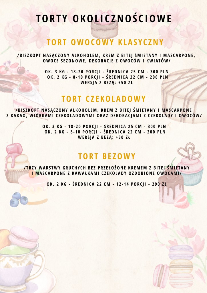 W CAFE 29 oferujemy wyjątkowe torty i ciasta – od klasycznych tortów owocowych i czekoladowych, po eleganckie torty bezowe i domowe wypieki pełne smaku i charakteru. Wszystkie nasze słodkości powstają na bazie naturalnych składników. Dzięki pasji i dbałości o detale każdy deser to połączenie smaku domowych wypieków z profesjonalną estetyką!